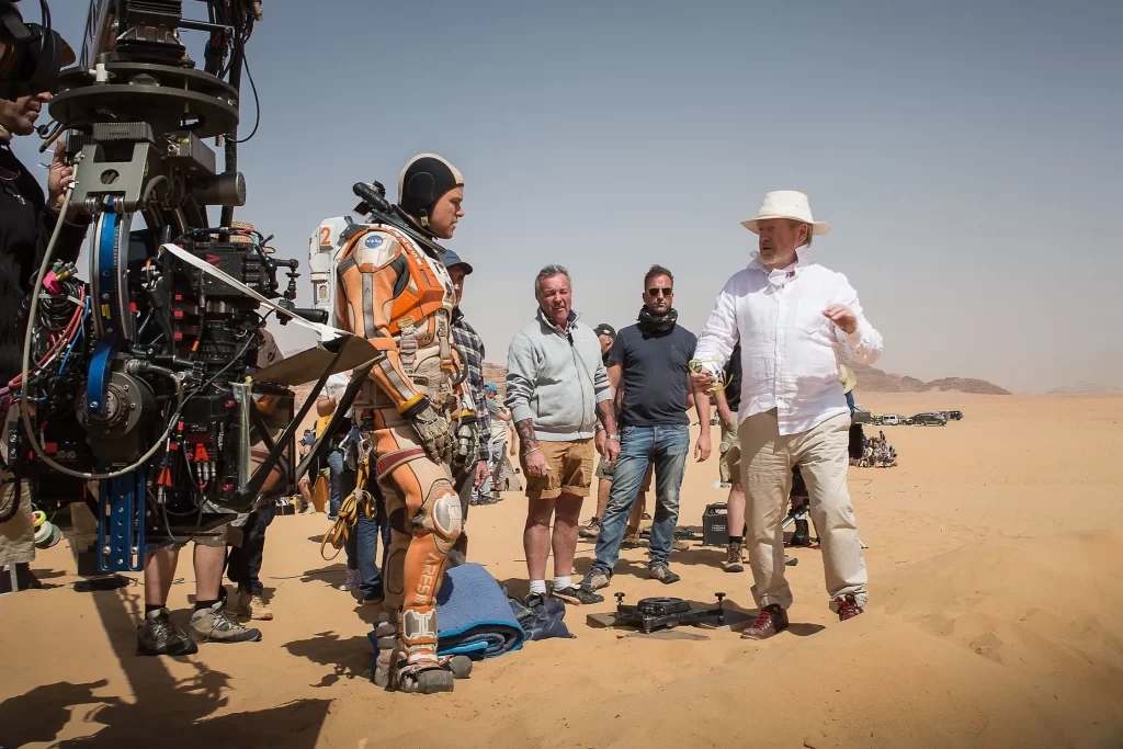 On location in Jordan, director Ridley Scott supervises actor Matt Damon’s performance in The Martian.